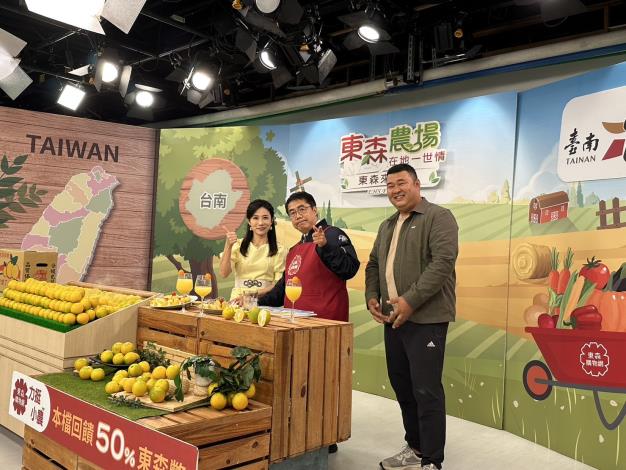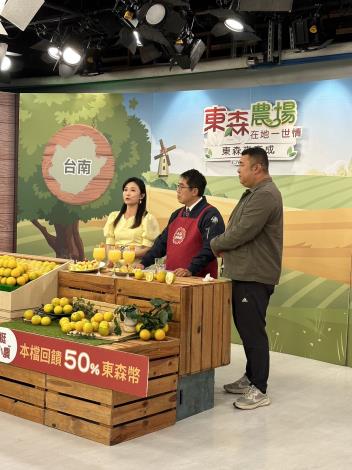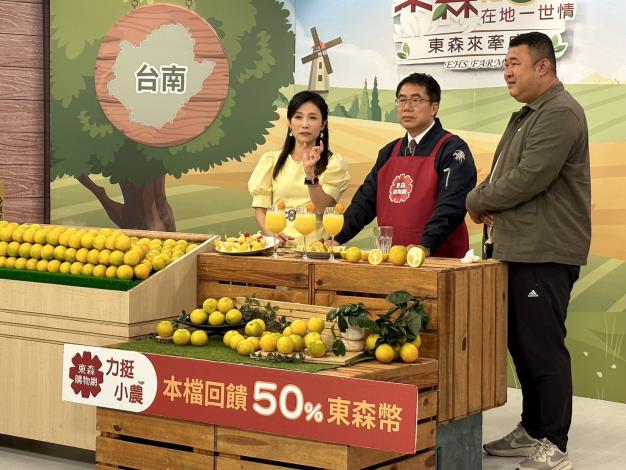 台南柳丁進入產季,台南市長黃偉哲去年12月即北上在東森購物台,專業叫賣台南東山區產出的頂級「台南老欉東坡丁」,銷售創佳績。今年黃偉哲再接再厲,再度登上東森購物台螢光幕,與更多好朋友分享東坡丁的魅力,銷出了6750公斤的好成績。黃偉哲表示,今年南部缺雨水,柳丁產量有受到影響,但依然挑選了最好的果實,要出貨給消費者。為了力挺台南小農,東森也推出下訂柳丁回饋東森幣50%優惠,刺激買氣。