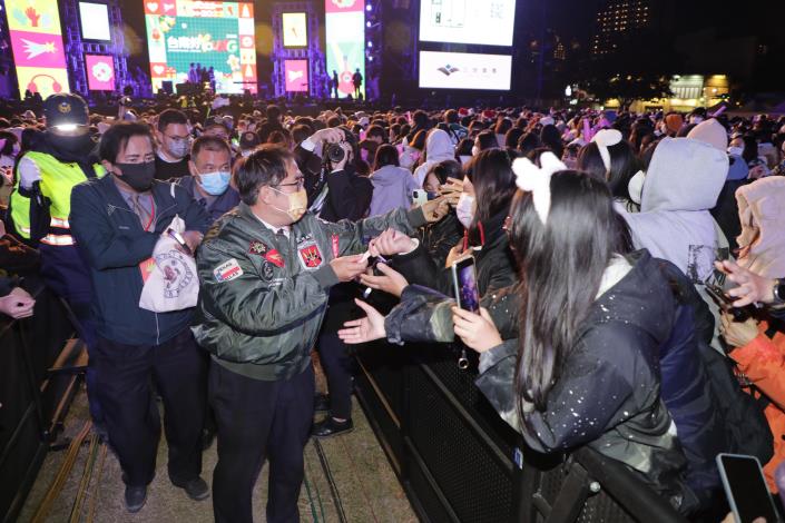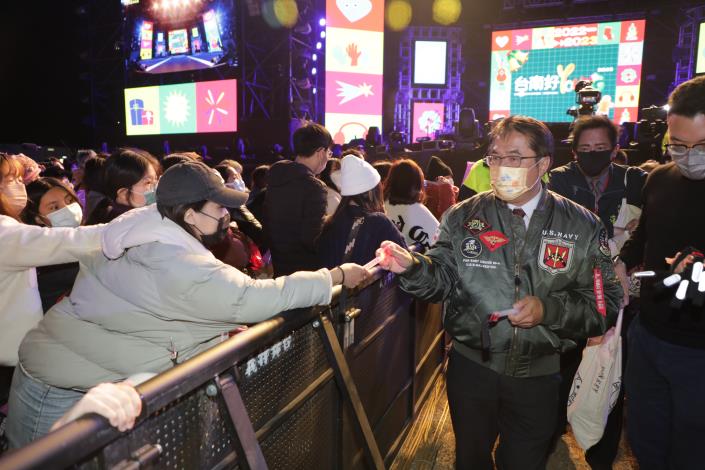 市長黃偉哲表示,非常開心現場來了12萬名的好朋友,一起來參加今天的演唱會,南市府運用有限資源,結合耶誕節及跨年活動,推出為期1個月的2023台南耶誕跨年系列活動,除了能讓市民朋友同樂,也讓外國人士可以盡情享受台南之美,感受到台南濃濃的人情味,另外,恰巧遇上寒流來襲,現場發放暖暖包,希望民眾都能注意保暖,在追星之餘,也要注意好保暖身體,接下來緊接著12/31的跨年,南市府也準備了全台最強的跨年節目與卡司,邀請大家屆時一起來參加,共同度過2022年的最後一刻,迎向新的一年2023的到來。