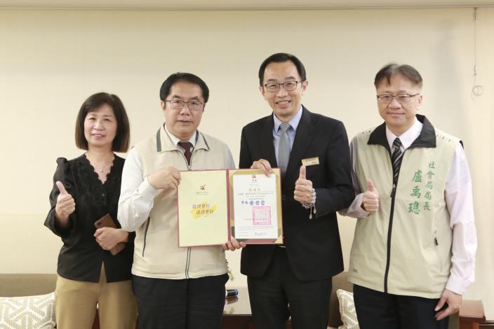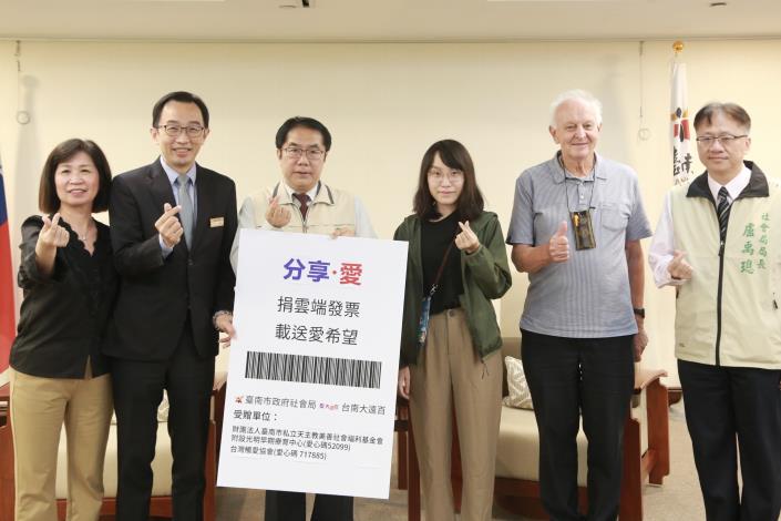 近年來台南市政府與台南大遠百合作,透過鼓勵消費者捐贈電子發票給社褔團體,達到環保並參與社會公益的目的,今(31)日社會局舉辦「112年度台南大遠百分享愛--雲端發票捐贈儀式」,市長黃偉哲在社會局長盧禹璁陪同下頒發感謝狀,由台南大遠百徐聖彬副理代表接受。市長感謝企業熱心參與公益之善行,天主教美善社會福利基金會附設光明早期療育中心執行長吳道遠神父、以及台灣觸愛協會江銘昌督導,都親自到場參與。