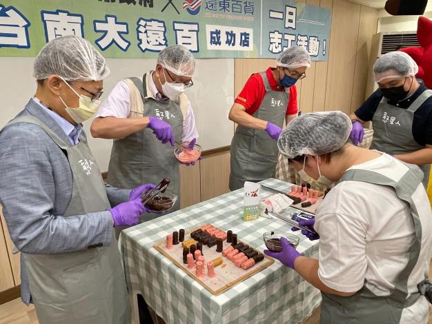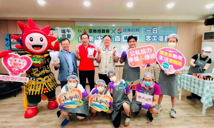 大遠百徐聖彬副理帶領同仁進行一日志工活動,陪伴憨兒一起手作芝心捲,感受端午佳節的氣氛。市長黃偉哲表示,感謝臺南大遠百多年來積極與臺南市政府合作,每逢佳節總是透過社會局捐贈禮盒及物資幫助弱勢。今年一日志工活動,透過同仁及身障者互動體驗,讓他們感受到更多社會的溫暖和支持,也期望更多企業響應社會公益,透過公私協力一起幫助弱勢家庭。