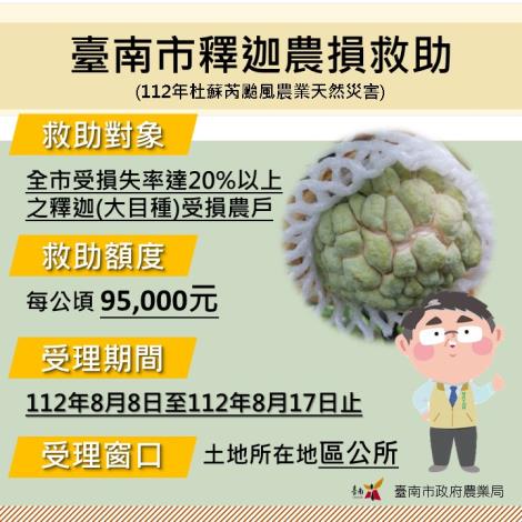 杜蘇芮颱風侵襲臺灣,對全省農作物造成災損,臺南市大目種釋迦,因受強風吹襲,有落果、枝條斷裂、果皮受損等影響作物生長及受損情形,已達到天然災害救助標準,農業部於8月7日公告本市為番荔枝(通稱釋迦,大目種)農業天然災害現金救助地區,災損每公頃救助9萬5千元。