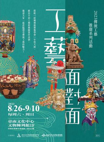 臺南市文化資產管理處與「臺南市府城傳統藝術學會」合作,辦理「工藝面對面──2023傳統工藝推廣系列活動」。自8月26日至9月10日的每週六、日,在臺南文化中心文物陳列館一樓,集合不同領域的藝師,推出十一場實作表演,以現場示範並講解技法的方式,引領大眾進入工藝世界。