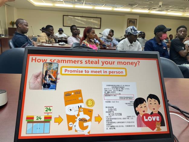 市警局犯罪預防科講師警務員柯相宇表示,外籍生來臺求學,渴望體驗臺灣的一切新奇事物,然而探索的過程佈滿陷阱,常見案例便是大學生遇到交友詐騙,被哄騙到超商買點數,詐騙集團在交友軟體放上帥哥、美女照片,亂槍打鳥廣發訊息,吸引人互動聊天,每天噓寒問暖,聊天內容全迎合自身喜好,讓旅居臺灣的遊子無助孤獨時,有人可以傾聽吐訴,好想跟這位理想情人見面,但這都是詐騙集團的手段,花時間讓人陷入情網無法自拔後,便用各種藉口不斷哄騙購買點數,甚至要脅要把私密照散布給親朋好友看,因此提醒大家「真愛不談錢」,未見面網友跟你「談錢換見面」、「投資共築夢」,都要立即警覺這是詐騙話術,果斷將對方封鎖或打165、110報警請求協助,才能將損害減到最低。