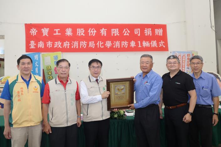 帝寶工業股份有限公司今(18)日捐贈臺南市政府消防局新營消防分隊化學消防車1輛,由市長黃偉哲代表接受捐贈,並回贈感謝獎牌。由於今日上午適逢山上區壓克力工廠發生嚴重火警,化學消防車也在捐贈儀式後,立即前往山上區救災。