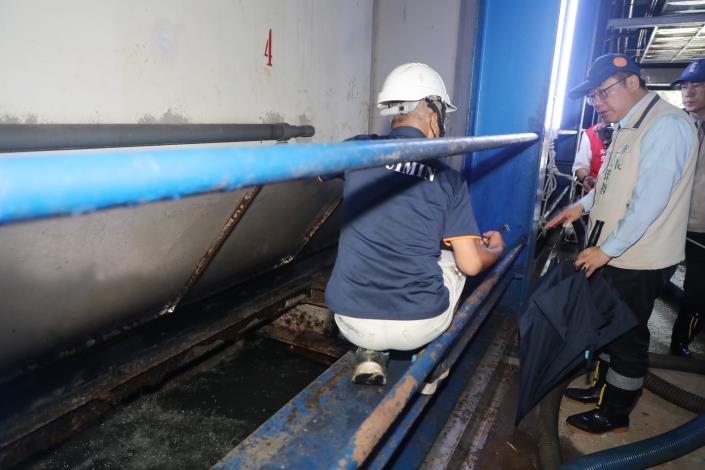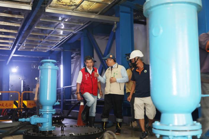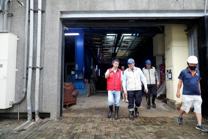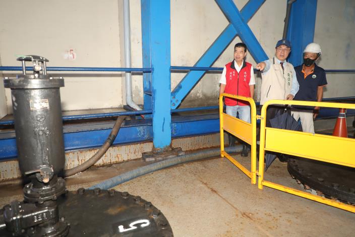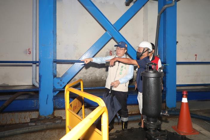 市長黃偉哲上午於防颱應變中心聽取工作報告後,隨即在水利局長邱忠川陪同下,前往安平漁人碼頭視察大潮水位,由於台南市適逢大潮,目前已有滿溢情況,他也再度前往安平抽水站,了解抽水機運作情形。