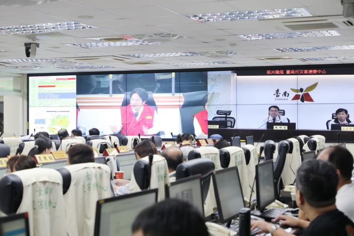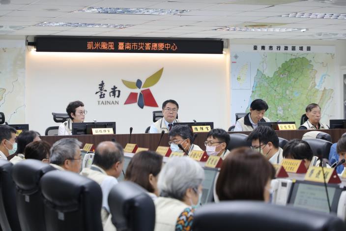 因應凱米颱風影響,台南市政府災害應變中心於昨(23)日晚間8時30分一級開設,並於會議中宣布今日台南市停班停課。市長黃偉哲於今早9時到災防中心視察召開防災整備會議,責請工務局及水利局隨時注意災情進度,確保道路暢通及市民安全。賴清德總統也在會議中,利用視訊了解各地方政府災情。會議結束後,黃偉哲隨即前往安平漁人碼頭、安平抽水站視察大潮水位及抽水機運作情況。
