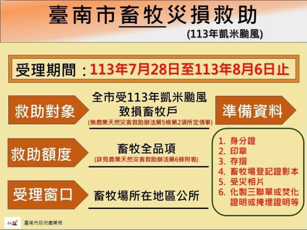臺南市政府農業局表示,國軍昨(30)日已協助完成重點清理作業,業者很感謝市府及國軍第一時間的協助,讓他們能盡速從災害中恢復。農業局亦提醒本次由農業部於7月27日公告本市為畜牧全品項農業天然災害現金救助地區,凡符合此項災害救助資格的畜牧業者,均請盡速於7月28日至8月6日止,向土地所在地區公所提出申請。申辦時務必攜帶「身分證、印章、存款簿、畜牧場登記證影本、受災照片、化製三聯單或焚化證明或掩埋證明」等相關證明文件,以加速救助審查流程。