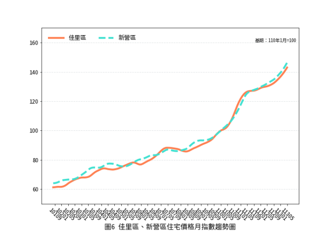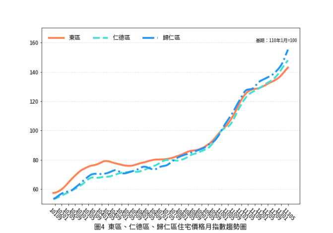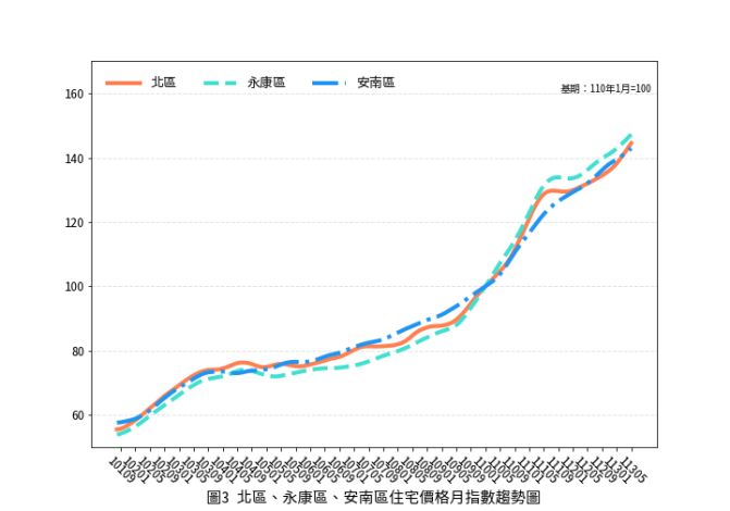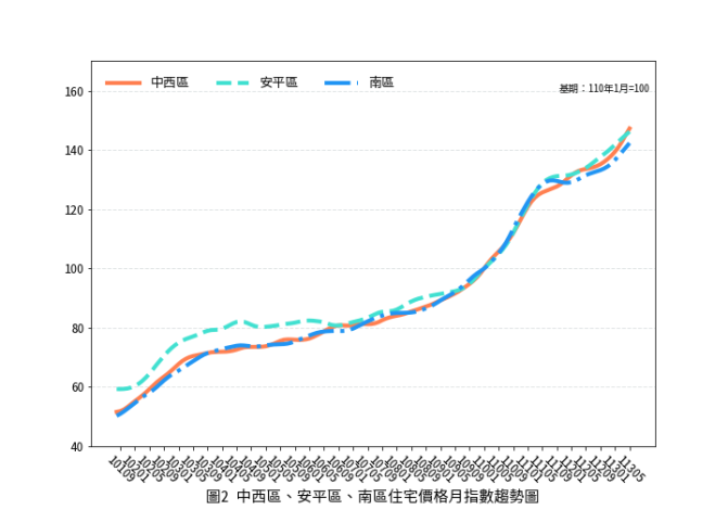 進一步觀察各行政區住宅價格指數表現,各行政區價格指數較前期以及去年同期均呈現微幅上漲情形,其中歸仁區漲幅最高,與前期相較微幅上漲1.80%,其次為新市區以及中西區,分別微幅上漲1.66%和1.43%。若與去年同期相較,漲幅最高的前三個行政區依次為歸仁區、仁德區以及新營區,分別上漲13.08%、11.43%以及10.80%,顯示在重大開發計畫的加持下,區域房市需求熱絡,價格也呈現穩定小幅上揚。而安南區價格指數漲勢逐漸趨緩,本期僅微幅上漲0.65%。綜觀南科區域住宅價格指數仍穩定上升,本期指數微幅上漲1.11%,較去年同期亦小幅上漲9.07%。