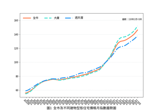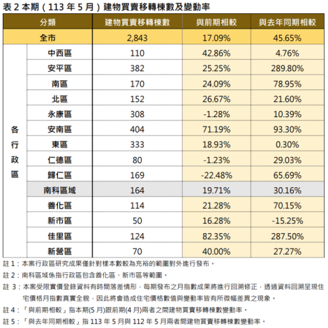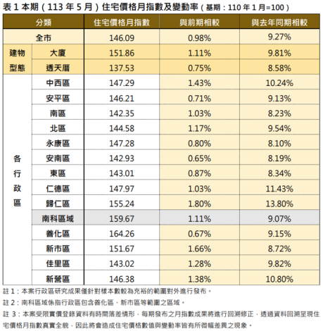 臺南市113年5月住宅價格指數出爐,本期住宅價格指數為146.09,較前期(4月)微幅上漲0.98%,相較去年同期則上漲9.27%。以住宅型態而言,本期大廈價格指數為151.86,透天住宅價格指數為137.53,與前期相較分別上漲1.11%、0.75%,大廈價格指數漲幅高於透天住宅價格指數。觀察各行政區本期住宅價格指數均較前期與去年同期呈現穩定微幅上揚趨勢;而交易量方面,本期全市交易量較前期增加17.09%,除歸仁區、永康區、仁德區外,其餘行政區交易量月變動率皆呈現正成長。