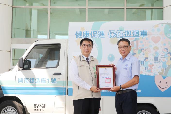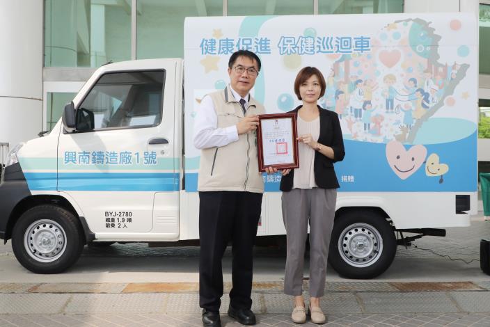 「興南鑄造廠股份有限公司」委託「台灣利他資源整合社會企業」設計公益專案,捐贈1部「健康促進保健巡迴車」予台南市,未來市民等待量測血壓、血糖的同時,還可喝杯咖啡或唱個卡拉OK,放鬆心情了解衛生保健知識。市府衛生局今(10)日於永華市政中心舉行捐贈儀式,由市長黃偉哲代表受贈並回贈感謝狀,表彰企業以實際行動回饋社會的善舉。