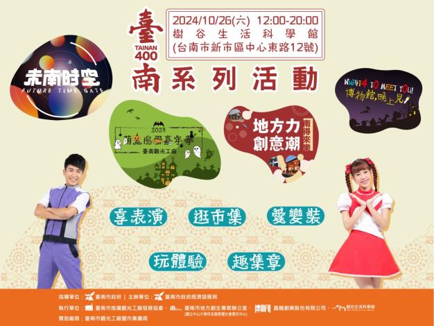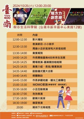 市長黃偉哲表示,此次「萌鬼搗蛋嘉年華」特別結合「台南400未來生活展─未南時空 Future Time Gate」、113年台南地方創生成果展「地方力.創意潮」以及「Night 4 t0 meet y0u!博物館,晚上見!」四大主題,共同歡慶台南400,讓每個參與者都能享受與眾不同的歡樂時光。現場將集結台南觀光工廠、地方創生及特色店家組成的特色與美食市集、地方創生靜態成果展、MOMO家族優格姐姐和檸檬哥哥帶動唱等各式活動。此外,以「大台南宇宙」為主題的未來生活展,將讓參觀者穿越時空,探索台南從貿易重鎮到未來科技城市的變遷。夜間,樹谷生活科學館將舉辦「博物館,晚上見!」活動,期待夜晚的博物館帶來驚喜的演出。