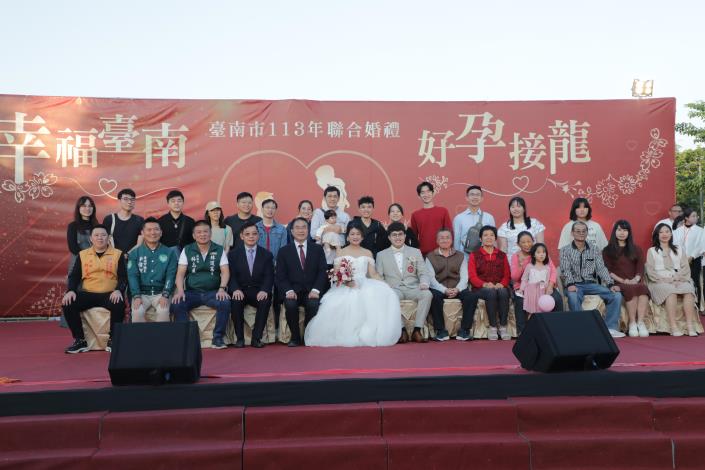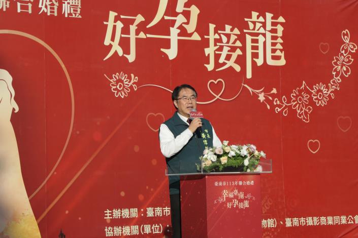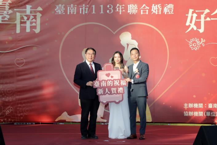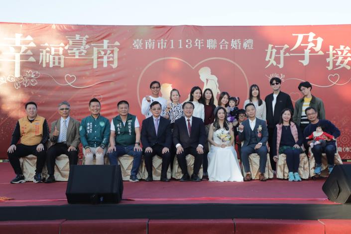臺南市113年聯合婚禮今(30)日在山上花園水道博物館浪漫登場,今年搭配臺南400及龍年元素,以「幸福臺南 好孕接龍」為主題,布置悠美的結婚典禮場景,由市長黃偉哲擔任證婚人,帶領新人宣讀誓詞,見證50對浪漫愛情故事,隨後黃市長與新人及親友合影留下美好回憶。立委郭國文及副議長林志展、議員李偉智到場表達祝福。