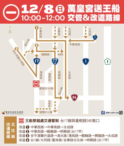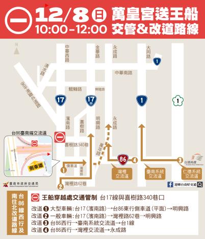 交通局局長王銘德表示,12月8日萬皇宮送王船,從喜樹路王船廠出發,沿喜樹路340巷到台17線路口處,將穿越台17線至黃金海岸,台17線路段將於當日上午10時至12時進行交通管制,請行經台17線、台86線的車輛預先改道,避開管制時間及路段,避免交通管制的影響。