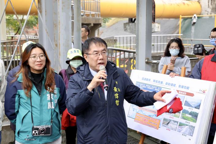 黃偉哲指出,自他上任市長迄今,已完成改善64公里區域排水系統及54公里雨水下水道系統;闢建12座抽水站,總計抽排量每秒可達170.75噸;完成9座滯洪池,合計滯洪量約320萬噸(相當於2.36座虎頭埤水庫容量);更新13站抽水站之老舊機組及11座老舊水門等。另外,亦積極推動全市移動式抽水機更新,預計今(114)年將再增購29台。