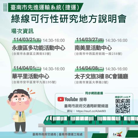 台南捷運綠線完成可行性研究修正成果,為向地方說明規劃內容及蒐集沿線居民意見,交通局將於114年3月21日、3月27日、4月1日及4月8日分別於永康區多功能活動中心、中西區南美里活動中心、安平區華平里活動中心及東區太子文旅會議廳召開4場地方說明會,歡迎民眾踴躍參加表達意見。
