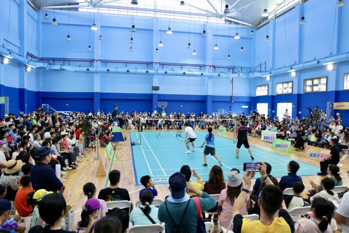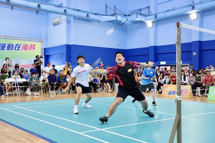今年活動的另一大焦點,則是李洋與園區羽球好手的熱血對決。比賽開局雙方即展現精湛球技,你來我往,攻防激烈。