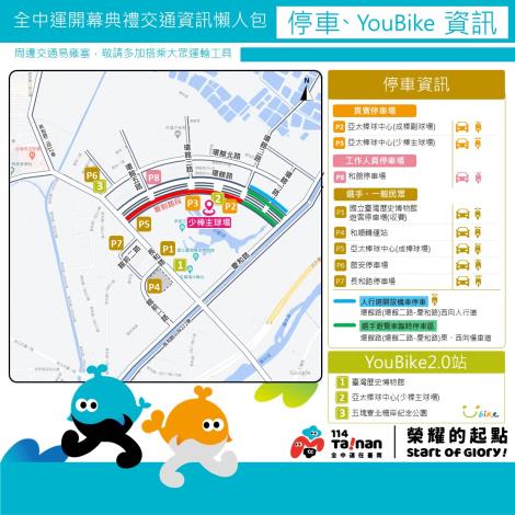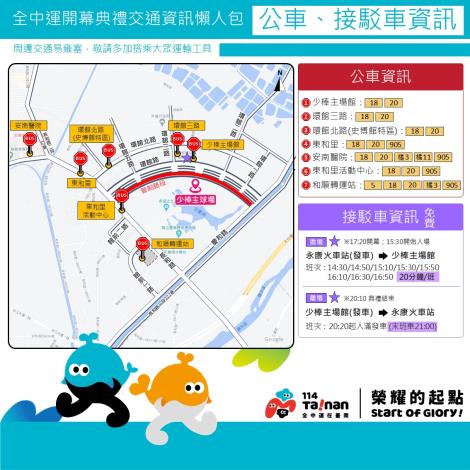 鑑於活動場地周邊停車空間有限,市府呼籲民眾多加利用大眾運輸工具前往,並特別規劃免費接駁專車服務,來回接送民眾往返永康火車站與會場。去程接駁車自4月19日下午2時30分起每20分鐘發車,末班車為下午4時50分;返程接駁則自晚上8時20分起人滿即發,末班車為晚上9時發車。為提供更多交通彈性,鼓勵民眾使用YouBike前往,鄰近站點包括臺灣歷史博物館、亞太棒球中心(少棒主球場)及五塊寮北柵岸紀念公園等,便利且環保。此外,民眾亦可搭乘5路、18路、20路、905路及橘3公車至會場周邊地點,詳細路線與時刻資訊請查詢「大台南公車」網站(https://2384.tainan.gov.tw/NewTNBusWeb/)。