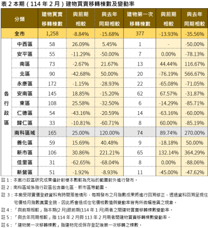 地政局局長陳淑美表示,114年2月國內經濟景氣信號分數為37分,與前期(1月)相較上漲2分,燈號維持為黃紅燈。國發會表示製造業銷售量指數、批發業營業額因AI需求強勁轉為紅燈,另領先指標及同時指標續呈上升,顯示當前國內景氣延續溫和成長態勢。本期住宅價格指數多數行政區微幅下跌,而交易量方面,全市2月建物移轉棟數共計1,258棟,較前期(1月)減少8.84%,整體買賣棟數與去年同期(113年2月)相較大幅衰退15.68%,顯示不動產市場隨著央行發布第7波選擇性信用管制,緊縮不動產貸款資金,市場呈現價跌量縮態勢。