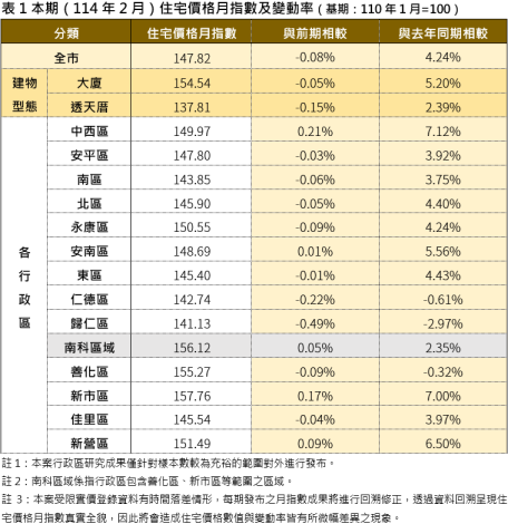 114年2月臺南市住宅價格指數為147.82,較前期(114年1月)微幅下降0.08%,相較去年同期則小幅上漲4.24%。以住宅型態而言,本期大廈的價格指數為154.54,透天住宅的價格指數為137.81,與前期相較,大廈價格指數微幅下降0.05%,透天住宅價格指數微幅下降0.15%。觀察本市各行政區本期住宅價格指數,多數行政區較前期呈現微幅下跌趨勢,然與去年同期相較呈現小幅上漲趨勢,價格出現反轉。而交易量方面,本期全市交易量較前期小幅減少8.84%,各行政區間交易量漲跌互見,並以新市區增幅30.86%最為顯著,反觀佳里區則有62.65%顯著的跌幅。