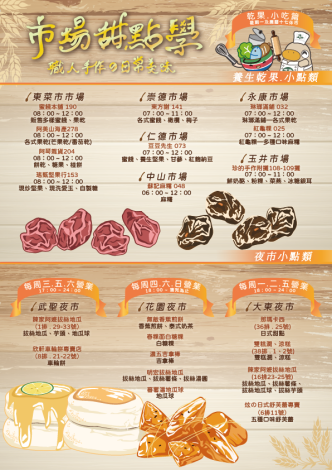 經濟發展局局長張婷媛指出,臺南的傳統市場及夜市不只是採買生鮮食材的地方,更是隱藏版甜點的天堂。本次推薦的人氣甜點包括:花園夜市的「濃五吉拿棒」,酥脆外皮,內裡柔軟,甜蜜道地西班牙風味;新營第三市場的「金月甜點屋」,戚風蛋糕蓬鬆柔軟,入口即化,甜而不膩,令人回味無窮;以及崇德市場的「東方謝」,專賣各式蜜餞,包括風味獨特的橄欖及各式酸甜的梅子,每一口都帶來滿滿的幸福感,且有濃濃懷舊風味。此外,還有各式應景甜點,如糯米製作的傳統糕點、手工布丁、粉圓、各式茶飲、豆花等等,每一口都充滿濃厚的人情味與職人的用心。