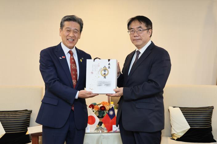黃偉哲也說明,台南也配合農業部對日本茨城縣的交流,提供鳳梨等水果,作為學童營養午餐,期待那珂市的學童也可以吃到來自台南的鳳梨等農特產品。今天也致贈六甲區出產的八田米禮盒給先﨑市長品嚐。