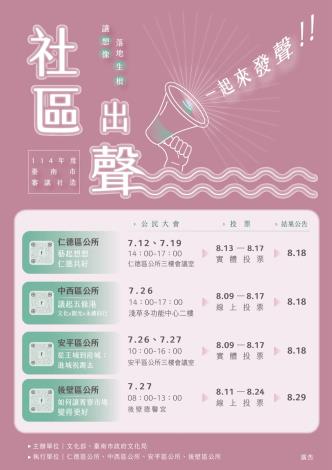 台南市文化局指出,「審議社造」不只是討論,更是一個以民眾為核心,融合知情、平等、包容與共識的行動歷程。歡迎市民朋友邀約街坊鄰居一起來發聲,讓每一個地方的好點子,都有機會在社區實現、在城市生根。