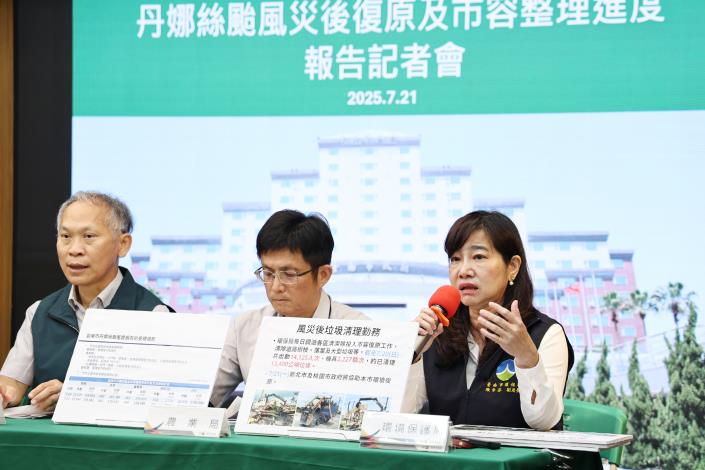 環保局表示, 為加速市容復原,環保局每日調派各區清潔隊積極清除倒伏樹枝、落葉及大型廢棄物等,截至7月20日,累計出動人力14,125人次及機具2,227輛次,清理垃圾量約13,400公噸。