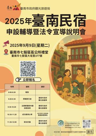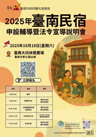 • 每週二於永華市政中心一樓設置單一窗口,提供民宿設立諮詢服務
