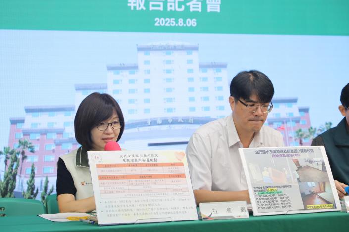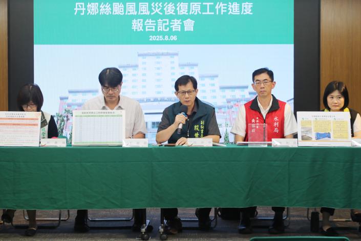 台南市政府今(6)日上午於永華市政中心召開丹娜絲颱風災後復原進度記者會,由副秘書長殷世熙主持,邀集工務局、民政局、社會局、水利局等單位說明房屋修繕、拆除工班媒合與政府補助方案、最近災民安置方案,以及澄清0802豪雨六塊寮排水機運作情況。
