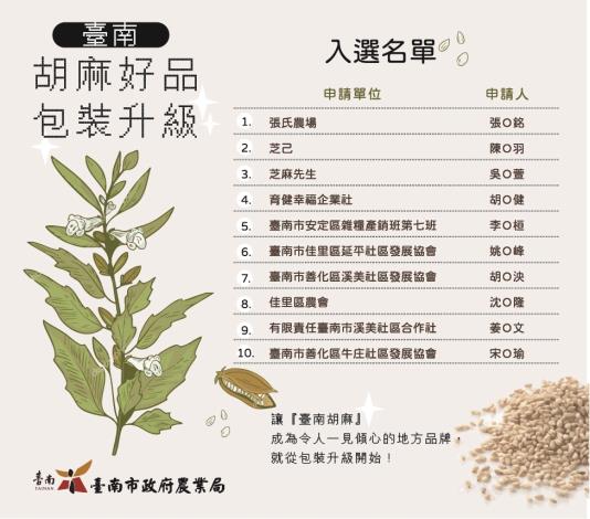 為推動臺南胡麻產品邁向品牌化與市場化,臺南市政府農業局今年啟動「胡麻好品包裝升級徵選活動」,自7月公開徵件以來,吸引多組來自農會、社區、青農與地方企業踴躍報名,經專家審查後共遴選出10組具備發展潛力的胡麻產品,將獲得專業設計輔導與品牌行銷協助,預計於10月中旬完成全新包裝亮相。