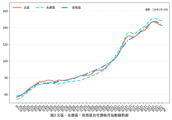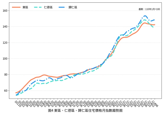 進一步觀察各行政區的住宅價格指數表現,多數行政區價格指數較前期相較呈現微幅下跌,其中以新市區的月跌幅最高,較前期相較微幅下跌0.59%,其次為善化區以及仁德區,價格指數均較前期分別微幅下降0.41%及0.34%。此外,仍可觀察到部分行政區月變動率維持於正成長,如佳里區、東區及歸仁區,月變動率分別為微幅上漲0.14%、0.09%及0.03%。若與去年同期比較,僅新營區微幅上漲3.41%,其他行政區皆呈下跌走勢。觀察本期價格指數表現,多數行政區住宅價格仍呈現緩步修正態勢,整體市場在價格表現上持續承受壓力,短期房價因政策動向及國際經濟局勢不確定性升高,預期下修的壓力仍舊存在。