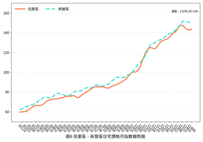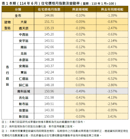 114年6月臺南市住宅價格指數為144.86,較前期(5月)微幅下降0.10%,相較去年同期則微幅下降1.39%。以住宅型態而言,本期大廈的價格指數為151.71,透天住宅的價格指數為135.19,與前期相較,大廈價格指數微幅下降0.05%,透天住宅價格指數微幅下降0.19%。觀察本市各行政區本期住宅價格指數,多數行政區相較前期及去年同期均呈現微幅下跌修正趨勢。在交易量方面,本期全市交易量較前期大幅增加了23.07%,其中表現較為亮眼者,以安平區的交易量增幅633.33%最為顯著,而歸仁區的交易量增幅以58.93%居次。