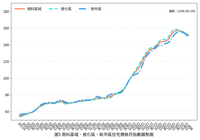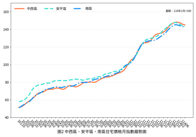 整體而言,本期臺南住宅市場呈現價跌量增情形。各行政區因重大開發計畫推進與新建案完工時程不同,房價表現漲跌互見。全國景氣指標仍屬穩定態勢。展望未來,市場動能仍高度依賴資金環境變化,購屋需求亦將呈現區域化發展;其中具備產業聚落效應及公共建設利多之行政區,預期將展現相對穩健之市場表現,有關詳細住宅價格指數資訊,將公佈於本府地政局網站。