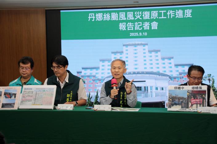 台南市政府今(10)日上午於永華市政中心召開「丹娜絲颱風災後復原進度記者會」,由秘書長尤天厚主持,針對屋損修繕與拆除媒合進度,以及各區復原情形,邀集工務局、民政局及相關單位說明最新成果與後續方向。