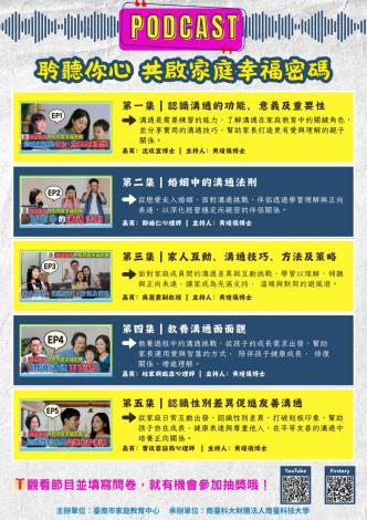 Podcast《聆聽您心 共啟家庭幸福密碼》已於各大平台(Youtube、Podcast等)上線,各平台連結: