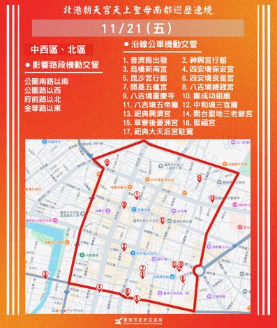 「2025乙巳年北港朝天宮天上聖母南都巡歷」活動,遶境路線將於20日(週四)起進入市區範圍,北區、中西區、安平區交通影響恐受較大影響,台南市政府交通局籲請市民朋友提早規劃替代路線,避開可能擁擠路段。