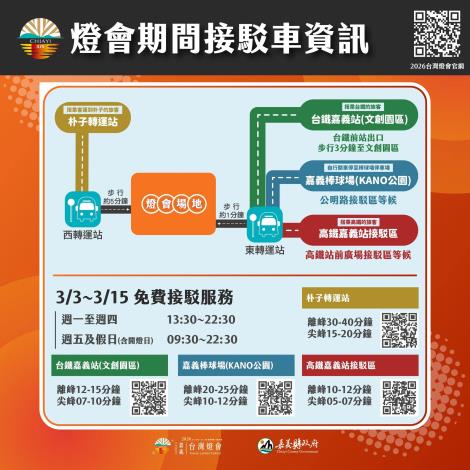 為方便各地旅客前往參觀,市府也規劃多條接駁路線,包括高鐵嘉義站往返蘭展園區的高鐵快捷線、後壁火車站接駁專車,以及下午加開的「跨縣市賞燈專線」,讓民眾無須自行開車也能輕鬆安排雙展行程。