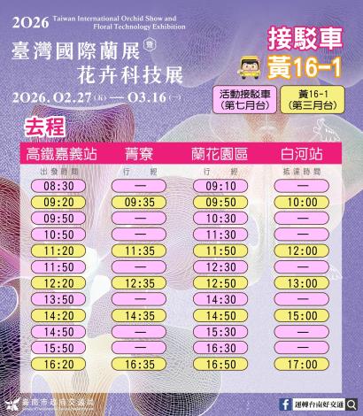 高鐵嘉義站 ⇄ 蘭花園區(經菁寮): 首班8:30、蘭花園區末班車18:30(每60分鐘一班)。