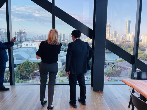 會議結束,黃偉哲特地準備了印有澳洲國旗的蘭花,泰特市長嘖嘖稱奇、誇獎不斷,盛讚蘭花之美與絕妙噴印技術。另外,黃市長也準備最新台南文創禮品「府城香」,希望將代表台南味道的香水,能讓泰特市長常常想起台南。泰特市長則邀請黃偉哲登上HOTA瞭望台,欣賞黃金海岸美麗全景。