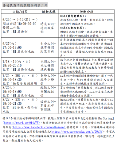 目前持續進行的有《青春記憶 X 城市際遇》線上圖文徵件,後續B1層將於6月27日(六)登場的《生命之河-說故事舞劇工作坊》,是由市民經網路報名,參與為期3週的培訓並經專業舞蹈老師指導創作,共同舞出關於運河水域中國城或河樂廣場的生命故事舞劇成果表演。另臺南市長黃偉哲掛心因疫情影響市民生計,亦導入市集規劃,預計6月27、28兩日於地面層辦理以台南攤商為主的文創市集,藉以活化地方消費潛力。