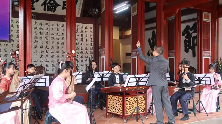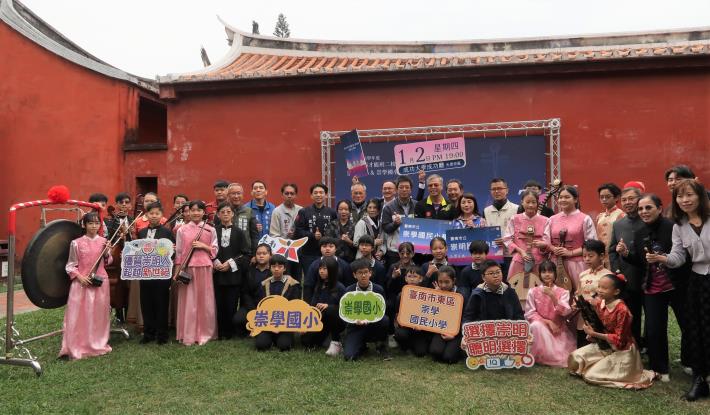 「長樂未央」-113學年度南市學校國樂藝術才能班聯合音樂會將於明年(114年)1月2日晚間7時在成功大學成功廳舉辦,今(19)日於臺南孔廟明倫堂舉辦宣傳記者會,由崇明國中及崇學國小2校絲竹樂室內樂團以臺灣民謠開場;學生現場展演樂器合奏,並與教育局陳宗暘代理主任秘書及與會嘉賓近距離互動,展現國樂魅力。