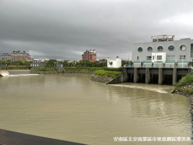 地政局陳淑美局長表示,位於安南區的北安商業區市地重劃區滯洪池發揮成效,滯洪池有效滯洪量達6.4萬噸,連同雨水貯留系統與低衝擊開發單元總蓄水量達15萬噸,另上游的草湖自辦重劃區滯洪池也有3.6萬噸,搭配北安抽水站每秒18噸抽水量聯合運作,有效改善鳳凰里及梅花里等社區、北安路二段周邊長年易淹困擾。