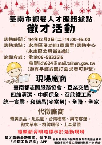 為打造黃偉哲市長「希望家園」的施政願景,勞工局積極辦理各項就業徵才活動,並因應產業求才需求,臺南市銀髮人才服務據點將於12月2日(二)下午2點至4點舉辦聯合徵才活動,地點於永康區多功能(南灣里)活動中 ...更多