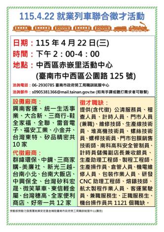 為打造黃偉哲市長「希望家園」的施政願景,勞工局積極辦理各項就業徵才活動,並因應產業求才需求,勞工局職訓就服中心將於115年4月22日(週三)下午2時至4時在中西區赤嵌里活動中心(臺南市中西區公園路12 ...更多